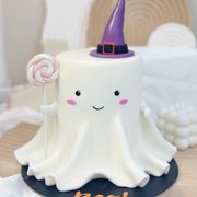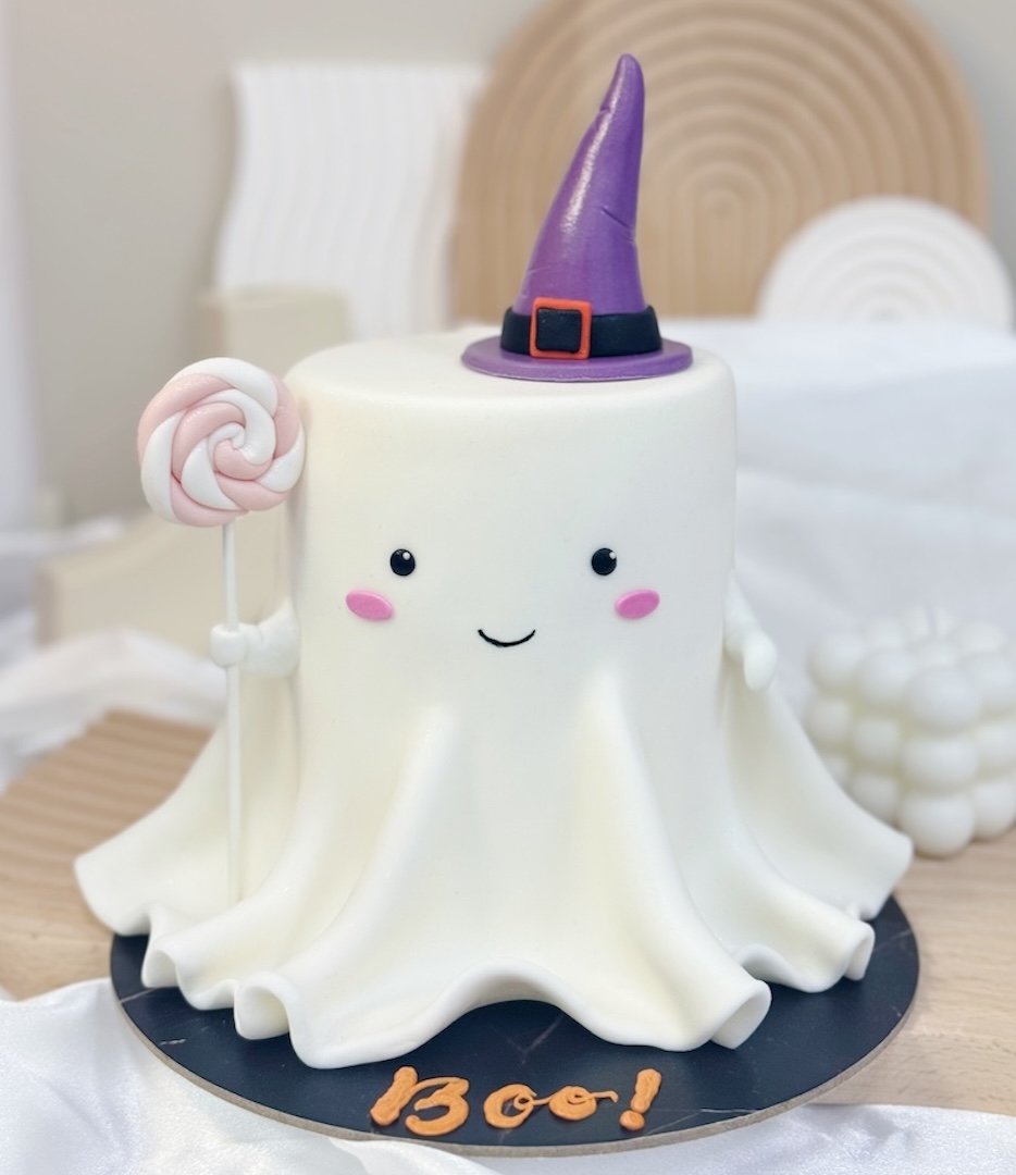 - A specially designed cute ghost shaped cake wearing a witch hat, for your Halloween celebration.